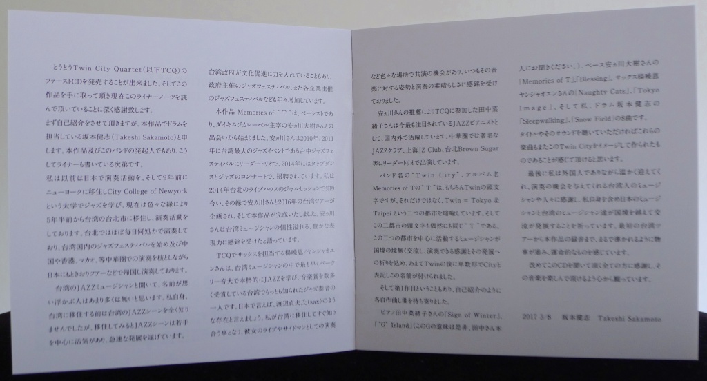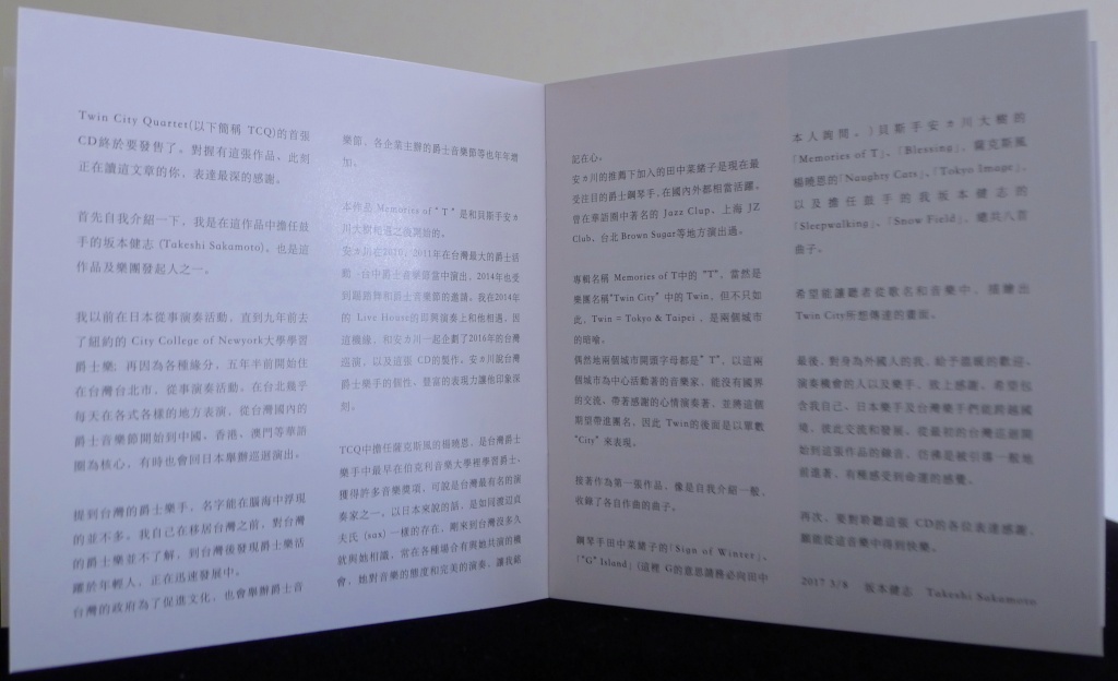 Sakamoto also provides a special essay in the liner notes with background information, where he notes the “/T/” of both “TCQ” and “Memories of T” being used to represent the /T/win cities of /T/okyo and /T/aipei.